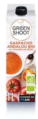 Tomate* 38.7%, eau de source, poivron rouge* 10,6%, huile d’olive vierge extra* 7%, concombre* 5%, oignon* 4%, vinaigre de Xérès* 2,9%,