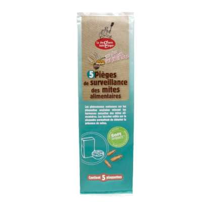 Le piège de surveillance des mites alimentaires permet de détecter la présence de ces mites. Les phéromones contenues sur les plaquettes engluées miment les hormones sexuelles des mites alimentaires. Elles vont attirer les mites qui vont se déposer sur la colle. Le piège n'est pas un traitement contre les mites. La quantité de mites piégées permet d'évaluer le degré d'infestation et de recourir au traitement approprié. La surface couverte est de 50 mètres carrés. La durée d'efficacité est de 2 mois. Inoffensifs pour les humains et animaux.