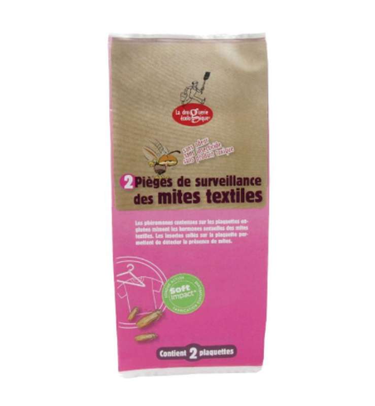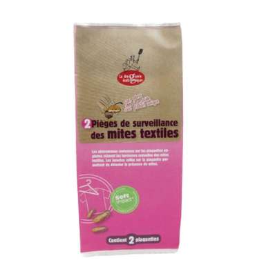 Le piège de surveillance des mites textiles permet de détecter la présence des mites textiles. Les phéromones contenues sur les plaquettes engluées miment les hormones sexuelles des mites textiles. Elles vont attirer les mites qui vont se déposer sur la colle. Le piège n'est pas un traitement contre les mites. La quantité de mites piégées permet d'évaluer le degré d'infestation et de recourir au traitement approprié. La surface théorique couverte est de 50 mètres carrés. La durée d'efficacité est de 2 mois. Inoffensifs pour les humains et animaux.