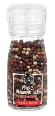 La région de Kampot, située au Sud-Est du Cambodge, bénéficie de conditions propices au développement d'un poivre exceptionnel. Poivre de qualité supérieure, l'appellation du Poivre de Kampot est protégée. Ces trois différentes baies proviennent du même arbre mais ne sont pas cueillis au même stade de maturité ce qui leurs donnent ces couleurs différentes. L’alliance des trois poivres de Kampot donne un équilibre parfait à ce mélange et permet à chacun d’apporter ses qualités propres.