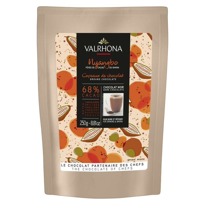Découvrez la saveur unique du Grand Cru Nyangbo, origine Ghana, sous sa nouvelle forme de copeaux de chocolat. Nyangbo est un chocolat noir 68% avec une touche arrondie d’épices et de douces notes de vanille.