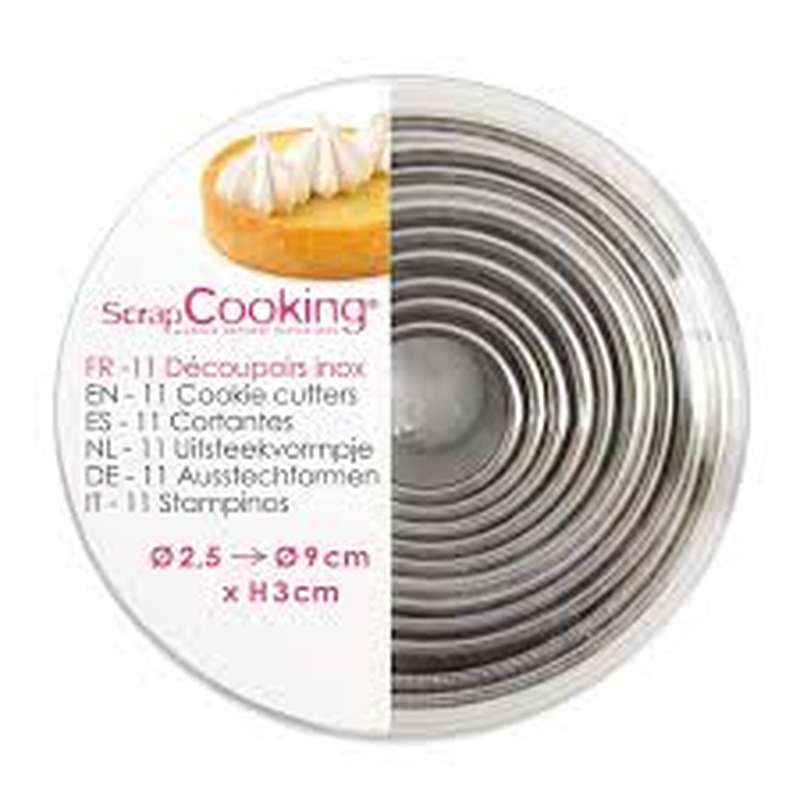 11 emporte-pièces de tailles différentes pour réaliser des desserts variés : tartelettes, biscuits, sablés... Et découper les pâtes à tarte, la pâte à sucre, le pain de mie...
