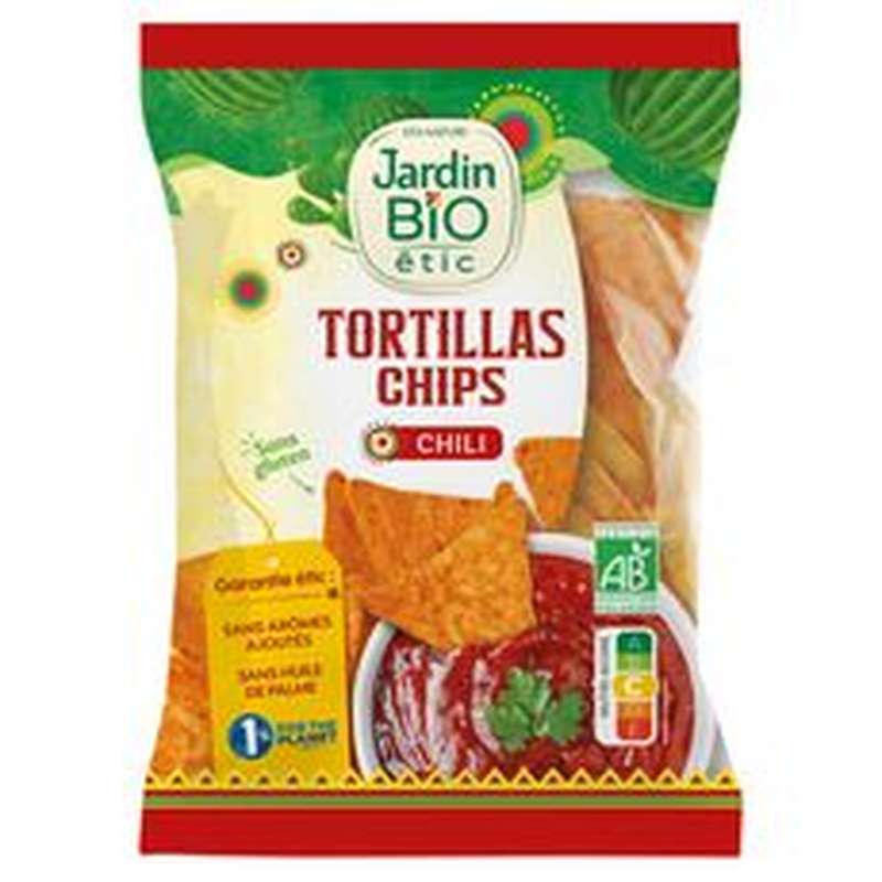 Ingrédients : farine de maïs*, huile de tournesol*, mélange chili* 4% (sel, poivron*, ail*, oignon*, sucre*, coriandre*, piment*, fénugrec*, livèche*). *produits issus de l'agriculture biologique.