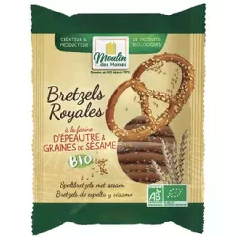 Les bretzels royales bio épeautre et sésame sont des biscuits apéritifs légers et croustillants, alliant le goût