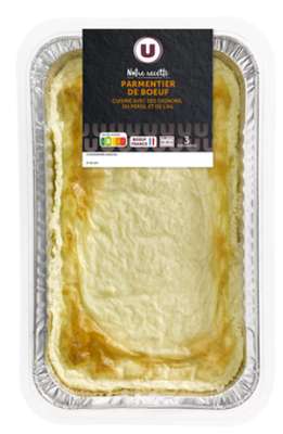 Purée de pommes de terre 65% (pommes de terre 48%, CREME légère, huile de tournesol, BEURRE, LAIT demi-écrémé, sel), viande bovine cuite (origine France) 14%, oignons 10%, eau, carottes, huile de tournesol, farine de BLE, persil 0,7%, sel, ail 0,2%, poivre.