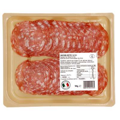Viande de porc (origine Italie), sel, dextrose, épices et plantes aromatiques, antioxydants : acide ascorbique, conservateur : nitrate de potassium-nitrite de sodium