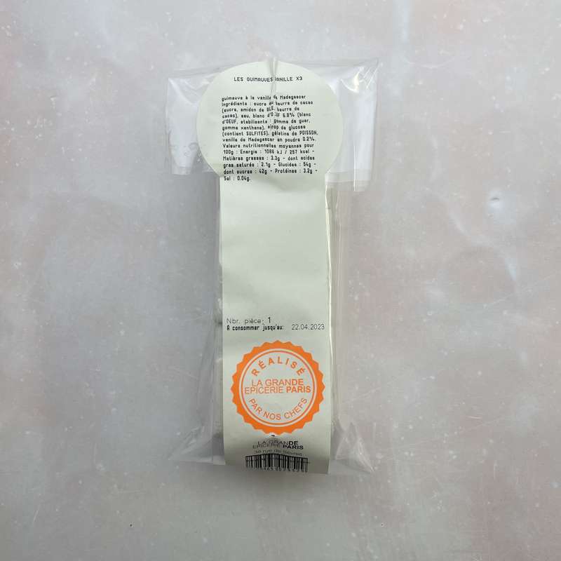 Appréciée pour sa texture moelleuse, légère et aérée, la guimauve de La Grande Épicerie de Paris a été confectionnée à partir de sucre au beurre de cacao, de blancs d’œufs battus en neige et de gélatine. Rehaussée des arômes de la vanille de Madagascar, cette guimauve est présentée en emballage de 3. Une confiserie fondante et raffinée à déguster en fin de repas.