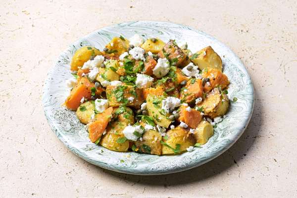 Des pommes de terres fondantes et des patates douces rôties au four, le tout accompagné de câpres et d'un superbe fromage de chèvre. Un plat relevé et intensément gourmand !