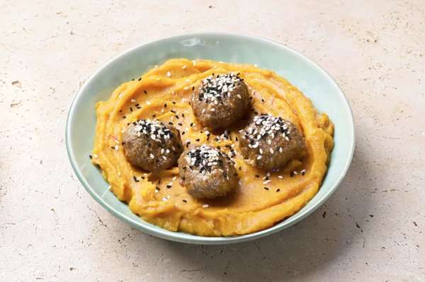 Une mousseline de patates douces bio faite à la main, des boulettes de boeuf françaises de la Cochonaille d'Olivier, le tout parsemé de graines de sésame. Un plat réconfortant, riche en beta-carotène et en vitamines, idéal pour la période hivernale !