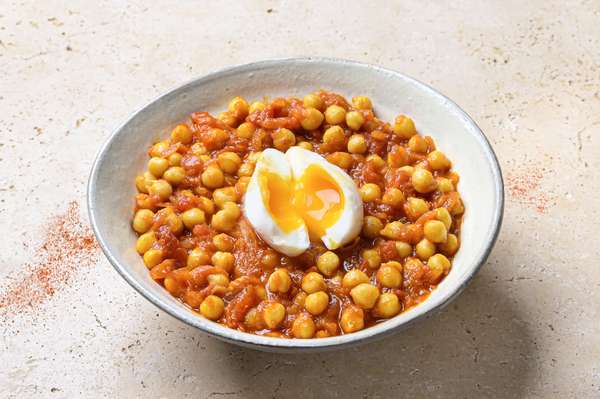 Mélange de pois chiche (Concassé de tomate, oignon, pois chiche, huile d'olive, sel, ail, cumin, paprika fumé), Oeuf mollet origine France