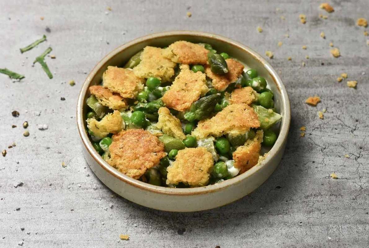 Le crumble, c'est encore meilleur quand c'est salé ! Celui-ci a un bon goût de parmesan et de basilic. Il accompagne des petits pois croquants, des asperges vertes françaises et une crème de pesto.