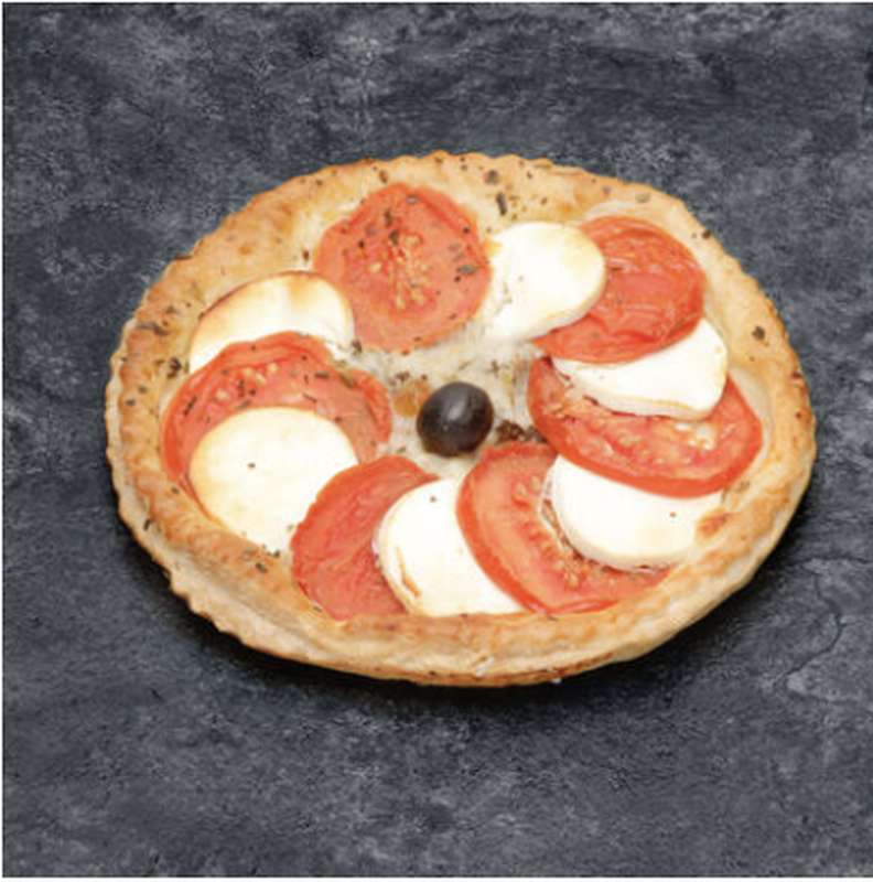 Garniture(tomates 27%,FROMAGE de chevre 19%,olives noires4%,MOZZARELLA(LAIT pasteurise,sel,ferments LACTIQUES,acidifiant:acidecitrique,antiagglomerant:cellulose),huile d'olive,herbes de Provence,origan,sel,poivre).Pate feuilletee purbeurre(farine de BLE,BEURRE,eau,sel,OEUF,sucre inverti).