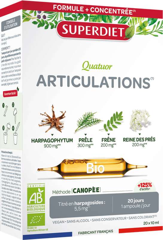 Découvrez la nouvelle formule du Quatuor Articulations de Superdiet, plus concentrée* et super dosée en plantes bio :