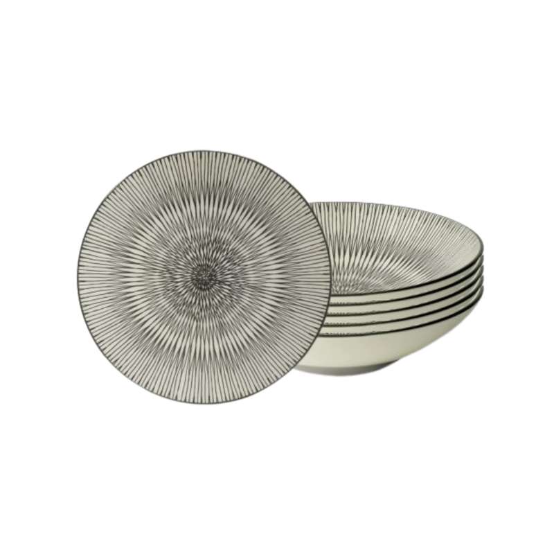 Assiette creuse à salade & pâtes 19 cm Hypnose. Cette collection graphique et contemporaine, avec son décor à l'effet rayonnant borduré d'un filet noir, apporte du caractère à votre table! En grès, un matériau facile à vivre qui passe au four et au micro-ondes. Nettoyage facile : passe au lave-vaisselle.