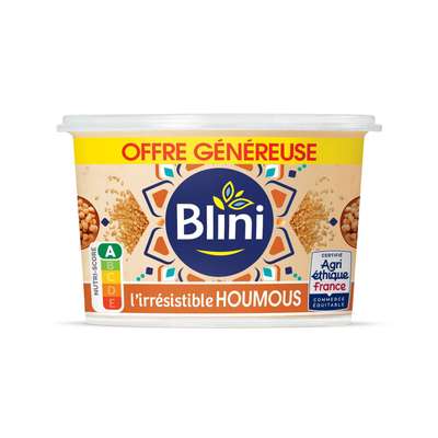 pois chiches 50% - huile de colza - eau - pâte de graines de SÉSAME 12% - sel - acidifiant : E330 - ail déshydraté - conservateur : E202. Traces éventuelles de lait, soja, céréales contenant du gluten, crustacés, œufs, poissons, céleri, moutarde, mollusques, lupin.