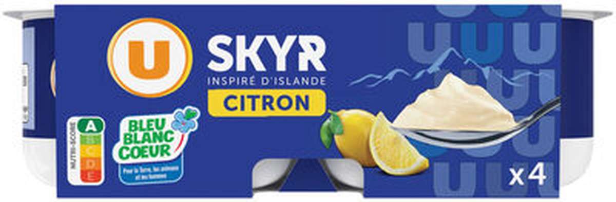 LAIT ÉCRÉMÉ pasteurisé 90%, sucre 4,9%, purée de citron 2,5%, amidon transformé de maïs, jus concentré de citron, arômes naturels, denrée alimentaire colorante : concentré de carthame, ferments (dont LAIT).